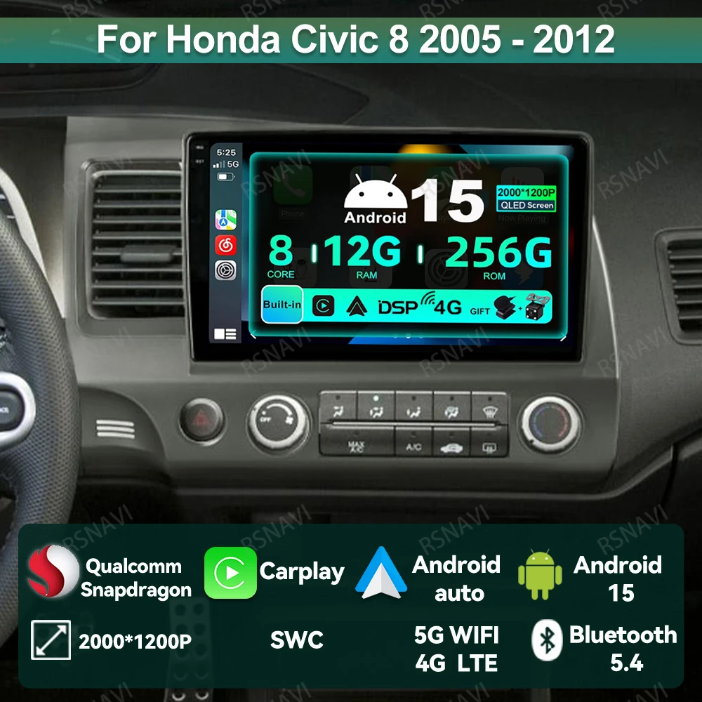 Car Radio Android 15 For Honda Civic 8 2005 - 2012 4G LTE Autoradio Stereo Multimedia DSP BT QLED Wireless Carplay Auto Qualcomm $133.50