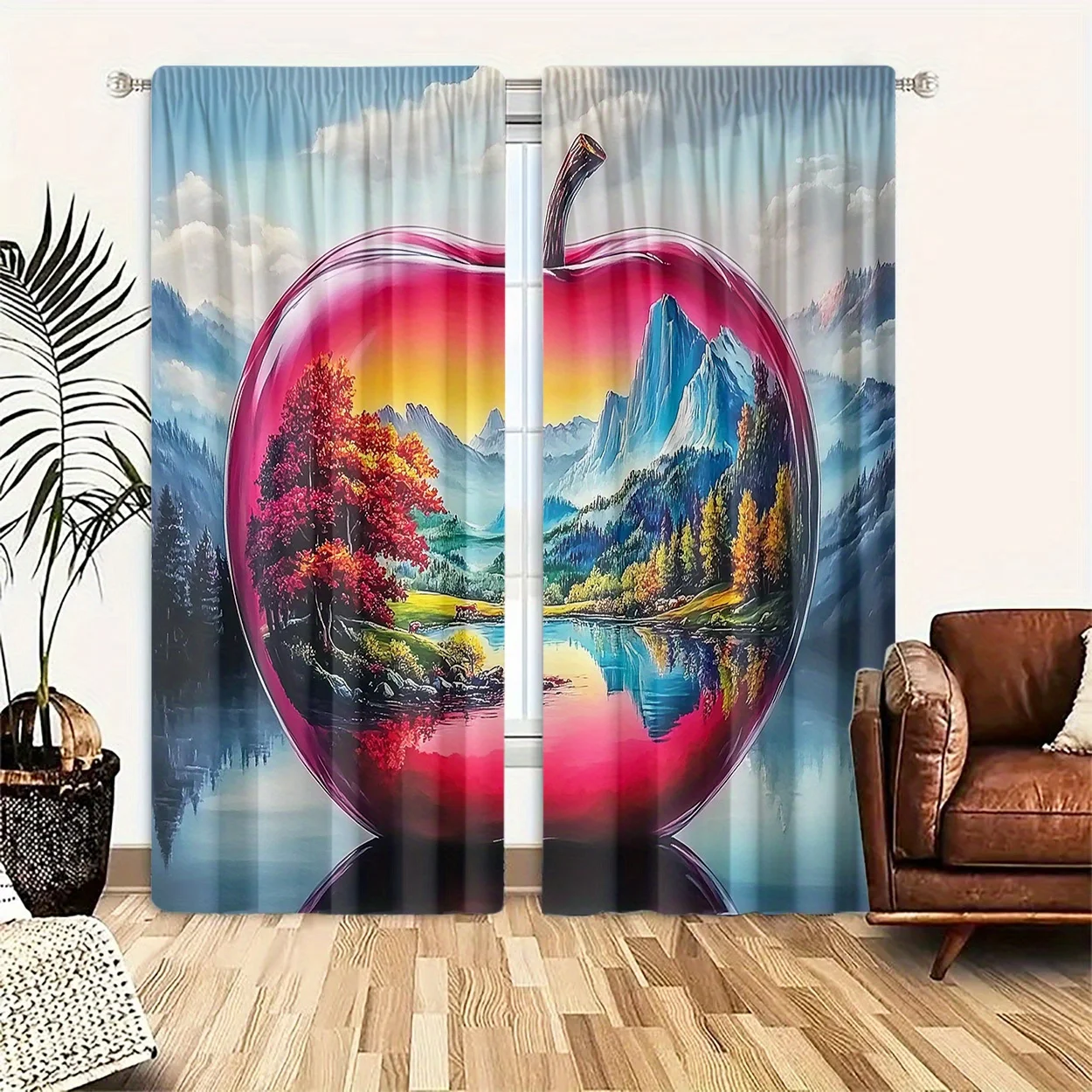 2pcs Artistic Apple Mirror Scenery Printed Blackout Curtains, Polyester Rod Pocket Drapes for Bedroom, Living Room, Office - Fad $17.19