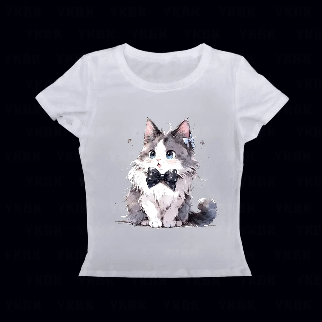 Cute Cat Women Harajuku Short Sleeve Crop Top 90s Y2k Top Aesthetic Graphic 2000s Gothic Tees Tops Clothes Female Baby Tee $7.91