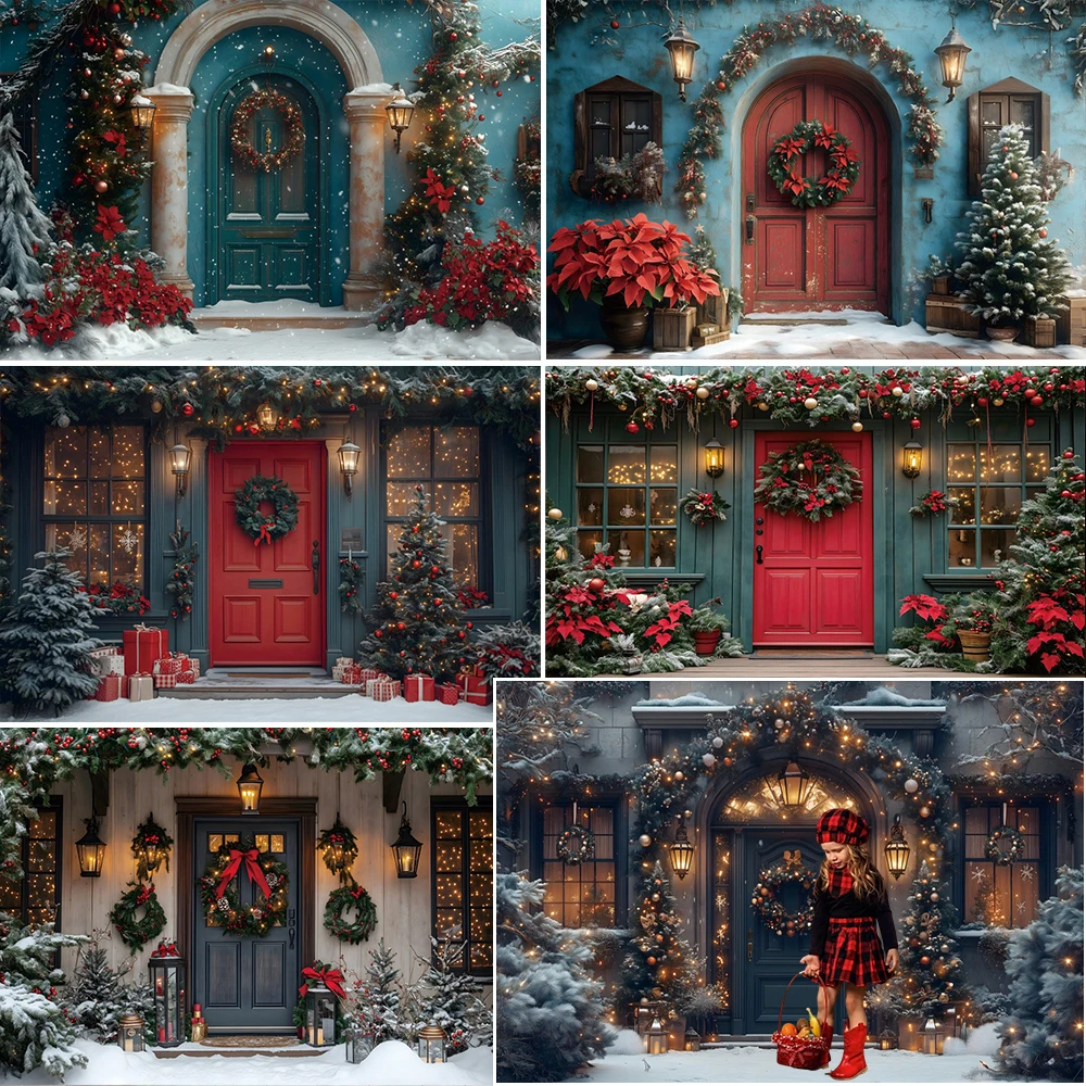 Christmas Backdrop for Photography Wreaths Red Wood Door Gifts Xmas Tree Snow Outdoor Decor Kids Baby Portrait Photo Background $5.15