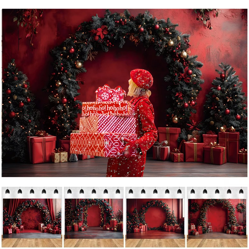 Christmas Backdrop for Photography Vintage Red Wall Arch Wreath Xmas Tree Gifts Family Baby Kid Portrait Background Photo Studio $5.15