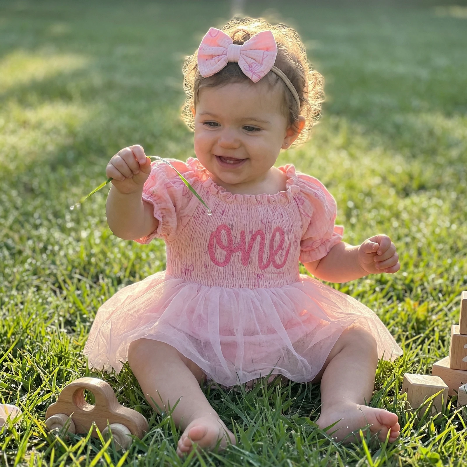 My First Birthday Outfit Baby Girl Summer Letter Embroidery Bow Print Short Sleeve Smocked Romper Dress Bow Headband 2 Piece Set $5.39