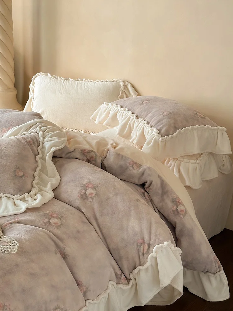 Romantic Lace Milk Velvet Four-Piece Bedding Set Princess Style Warmth Thickened Printed Bedding Cover for Winter $107.82