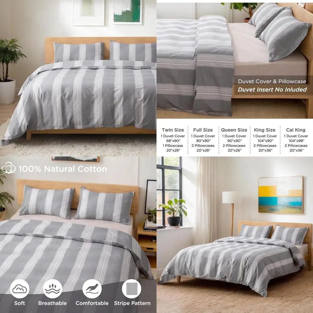 Natural Cotton Striped Duvet Cover Set, Breathable 3-Piece Bedding in Light Grey & White (Queen, 90x90, without Comforter) $51.37