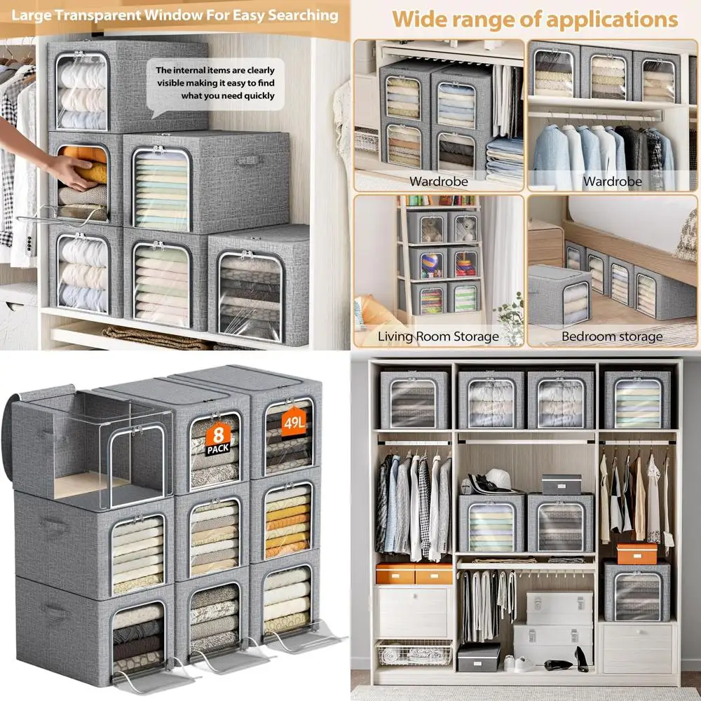 8-Pack Collapsible Fabric Storage Bins with Lids, 49L Stackable Boxes for Clothes, T-Shirts, Sweaters, and Bedding, Light Grey $67.81