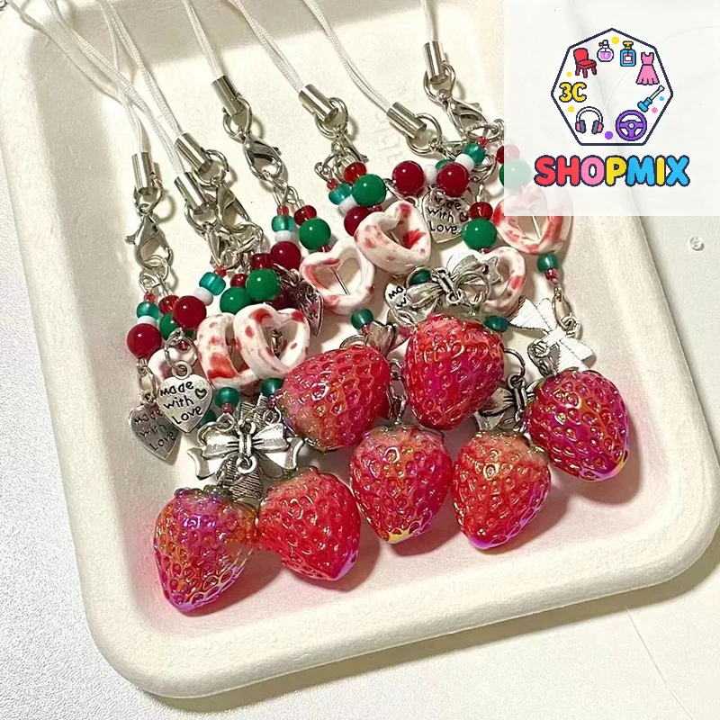 Unique Sweet Strawberry Phone Charms Pendant Cute Bow Heart Beaded Keychain Camera Schoolbag Decoration Accessories Gifts $3.82