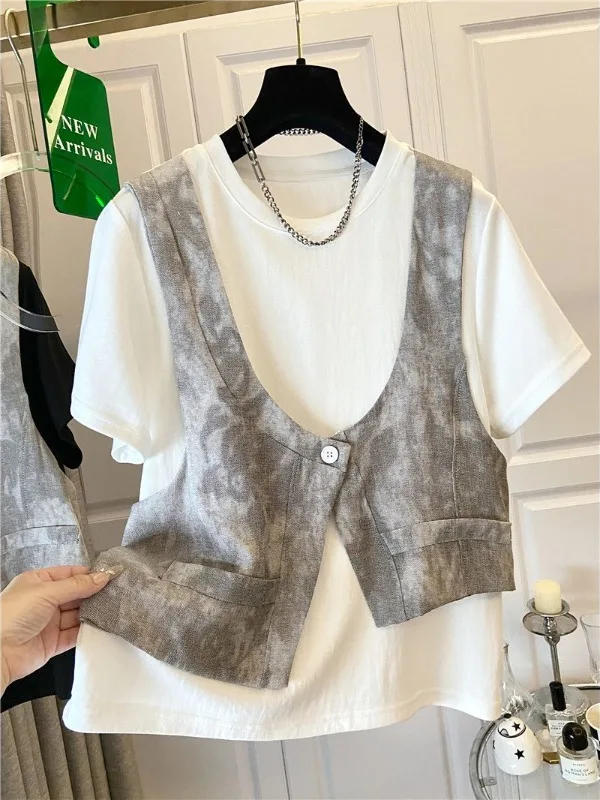 Casual Style Oversized Short Sleeve T-Shirt Vest Patchwork Design Large Size Women's Fashion Top Summer Season round Neckline $28.19