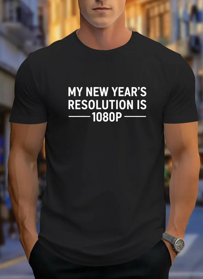 Men's Casual Short Sleeve Graphic Tee - "My New Year's Resolution is 1080P" Slogan Print Black Crew Neck T-Shirt Summer Fashion $13.44
