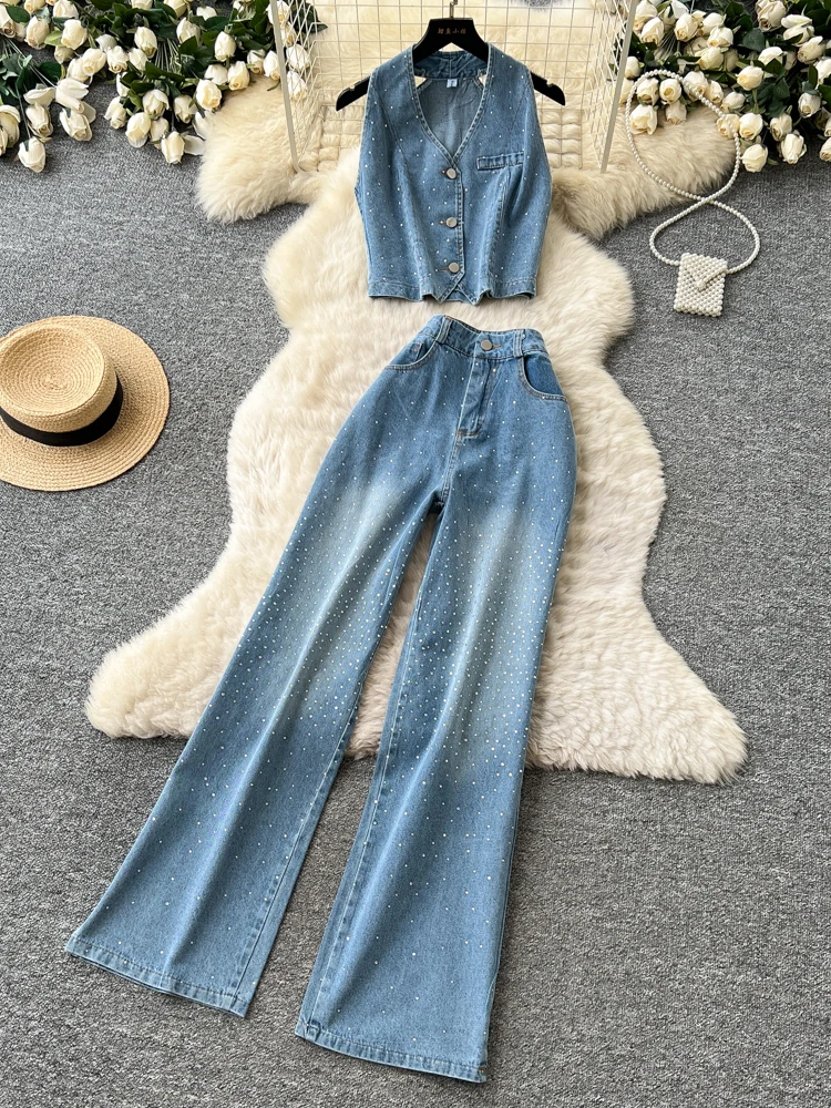 Slim Fit High Waist Denim Set Summer Sleeveless Neck Hanging Vest Women Fashion Two Piece Suit Commute Style Casual Workwear $58.99