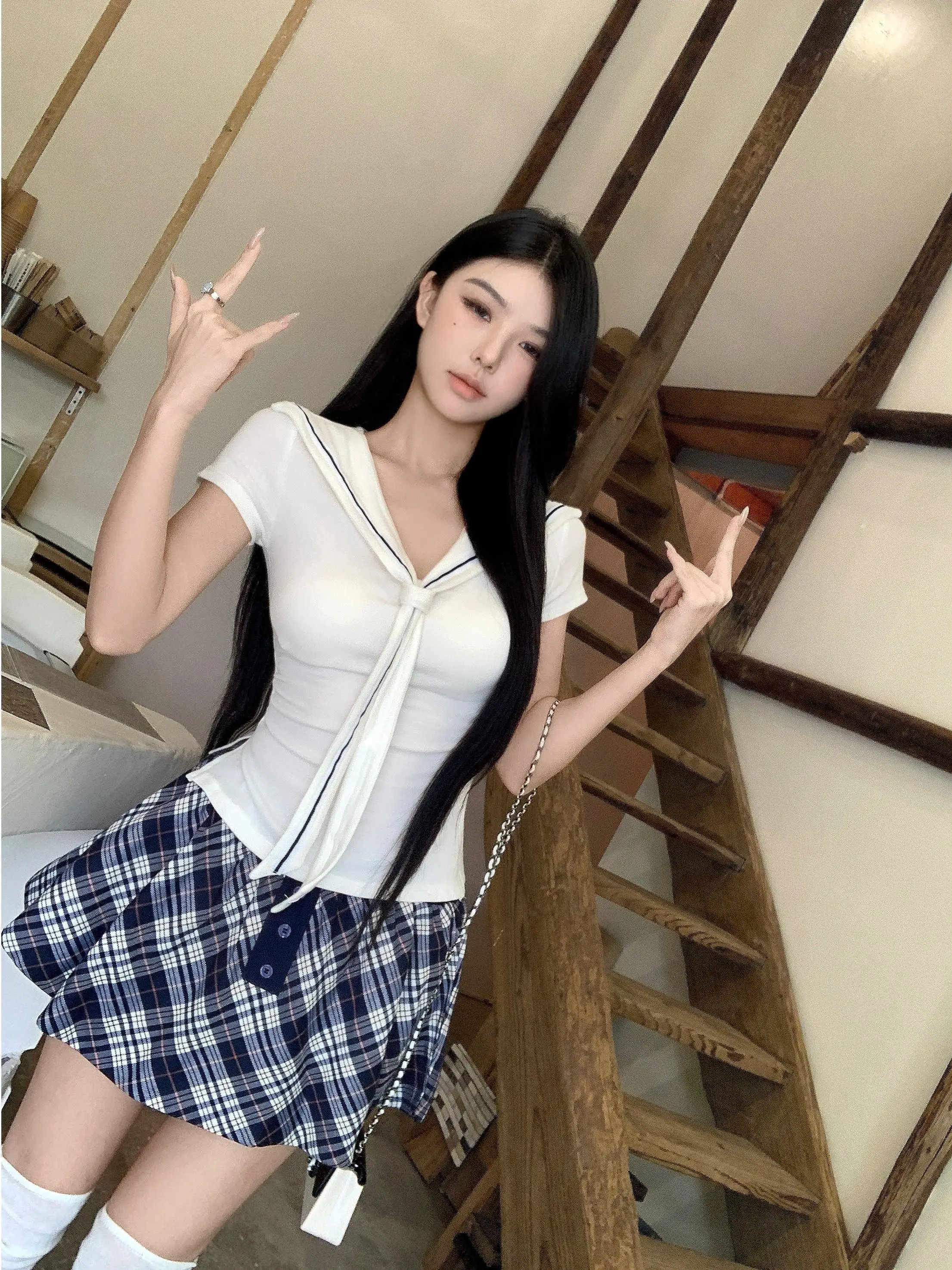 Preppy Style Women's Two-Piece Set Spring 2026 White Navy Collar Short Sleeve T-Shirt Plaid Skirt Slim Fit Commute Fashion $29.59
