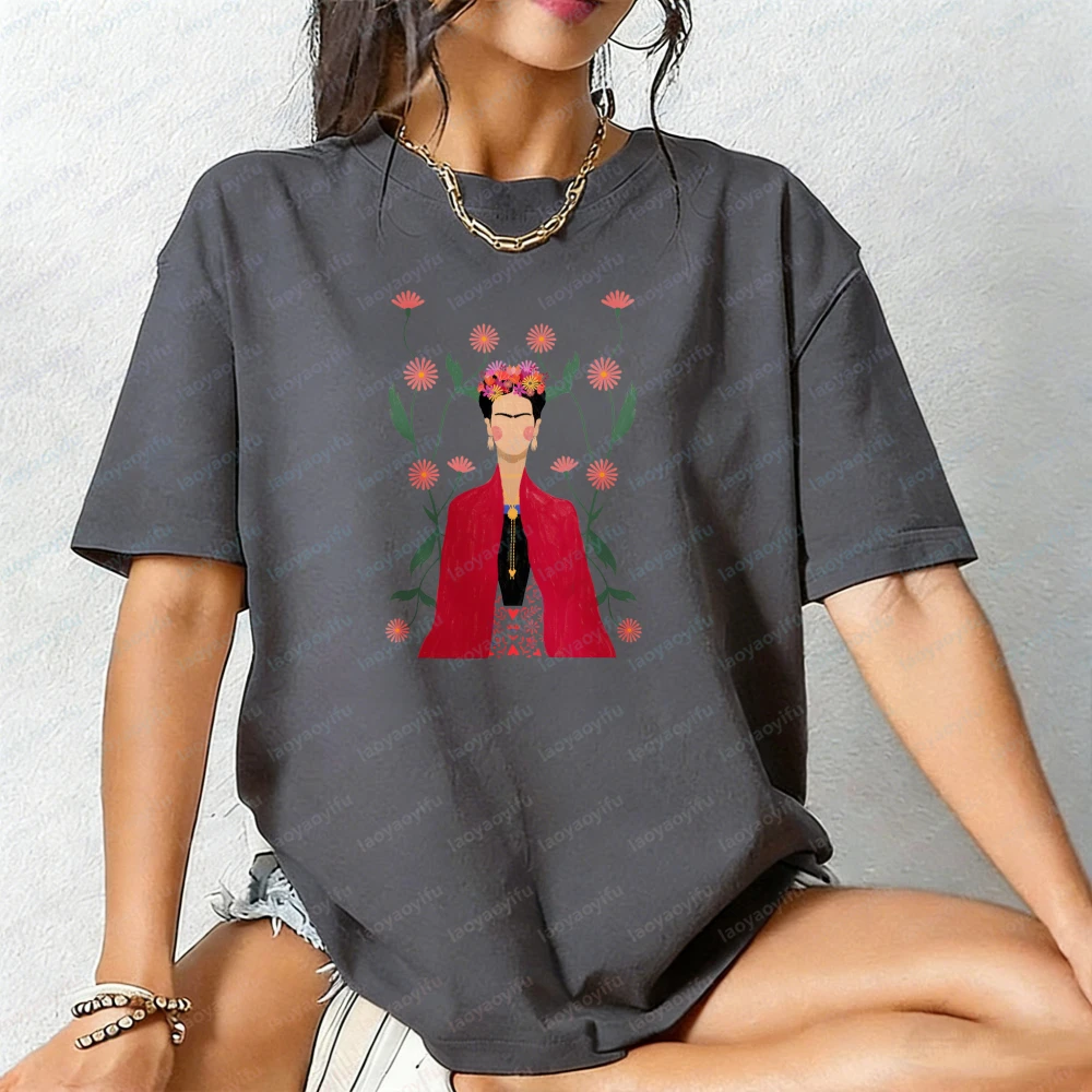 Bohemian Style Frida Kahlo Floral Portrait Artistic Shirt Floral Elements Unisex Cotton T-Shirt Fashion Casual Summer Cotton Tee $11.51