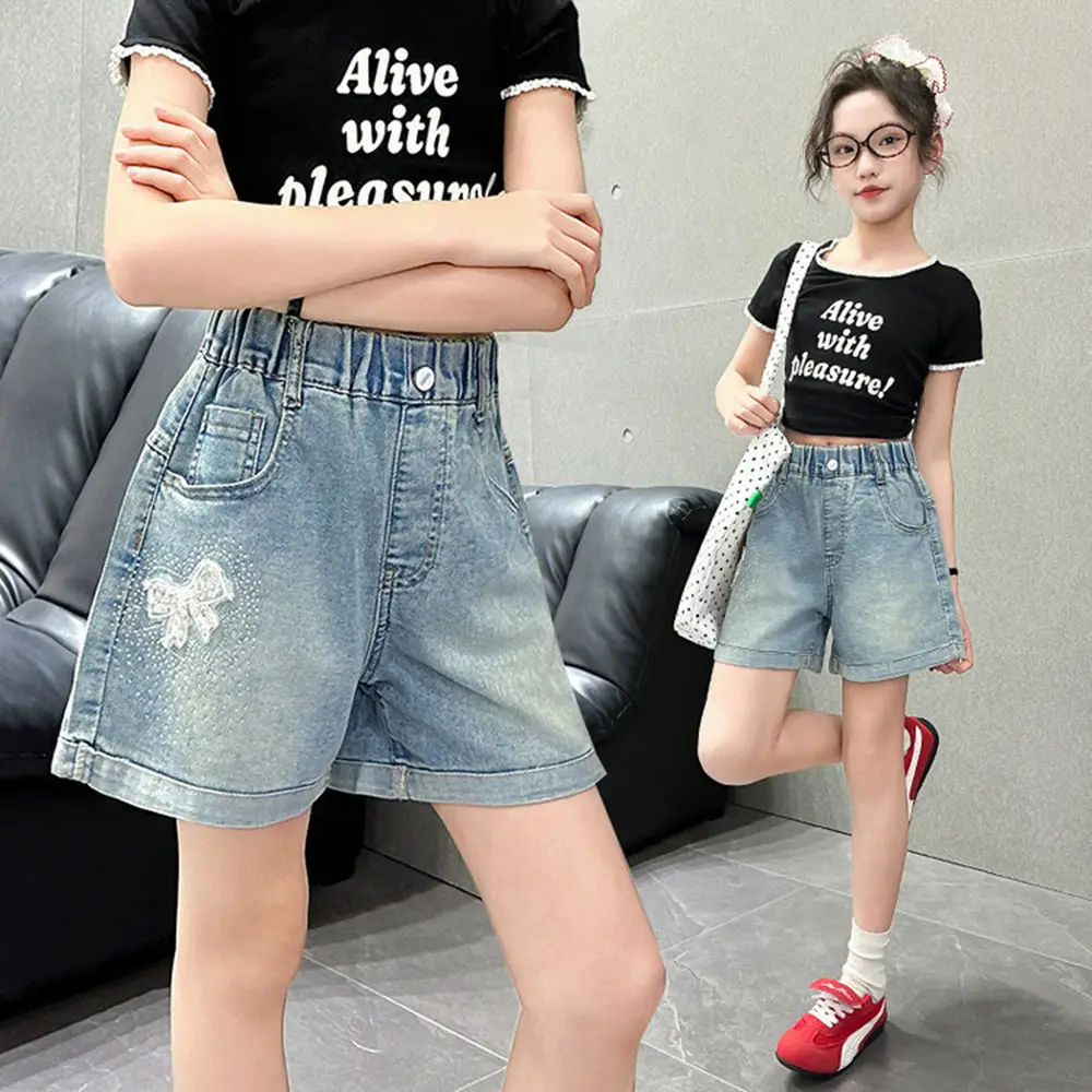 Fashion Kids Denim Shorts for Summer 2026 New Style Teenage Girls' Casual Bow Hot Diamond Shorts for 5-14 Years $7.08