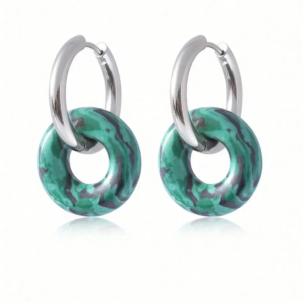 A pair of women's fashionable pink crystal agate malachite round earrings, natural stone hoops, stainless steel ear rings $10.83