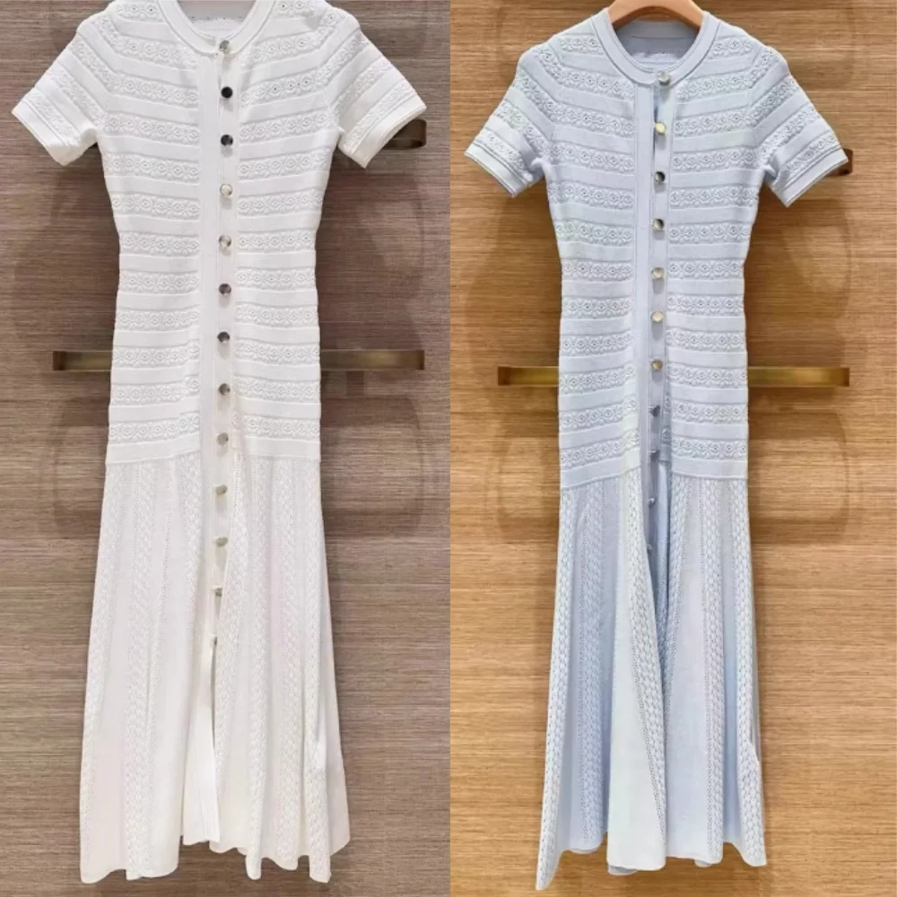 Early Spring 2026 Women Knitted Maxi Dress Hollow Out Round Neck Single Breasted Short Sleeve Slim Blue or White Robe $93.39