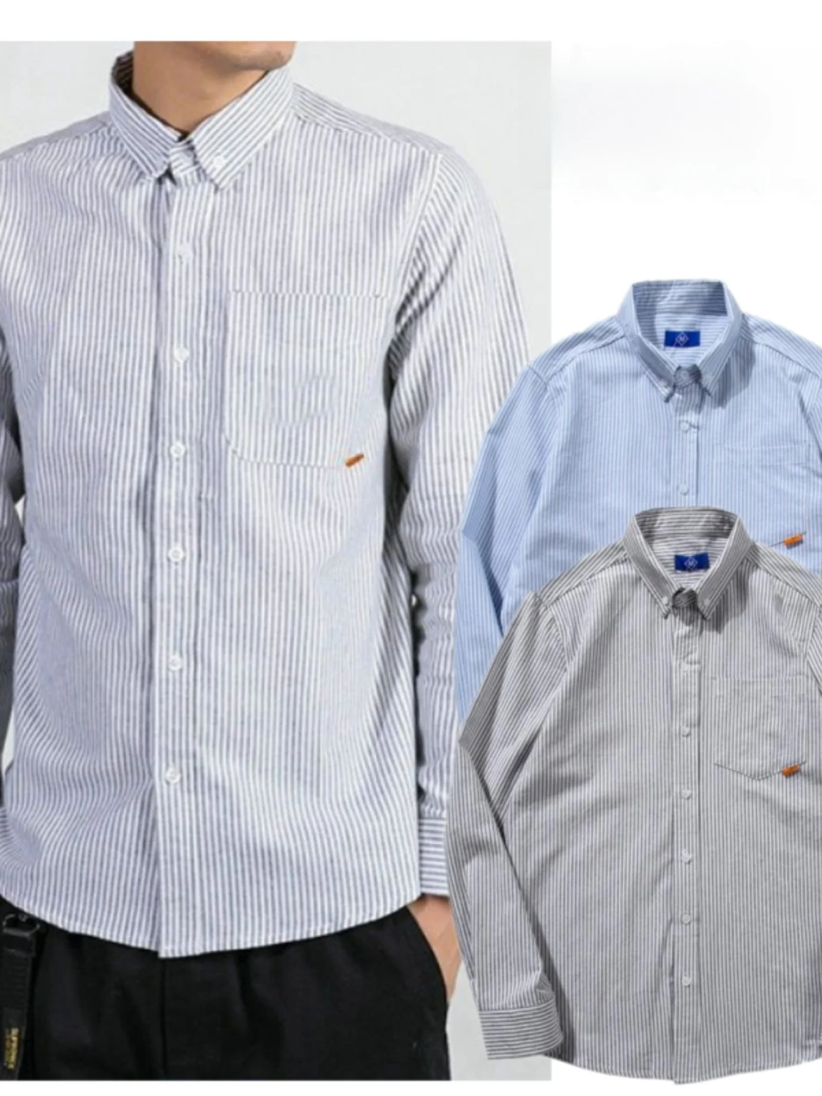 Autumn Winter Stripe Pure Cotton Oxford Cloth Men's Long Sleeve Shirt Simple Pocket Logo Brand Fashionable Youth Style Shirt $25.13