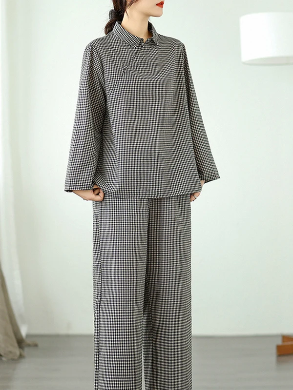 Spring 2026 Fashion Plaid Set Loose Elastic Waist Long Sleeve Shirt Turn-down Collar Wide Leg Pants Two-piece Set Women's Clo... $29.82