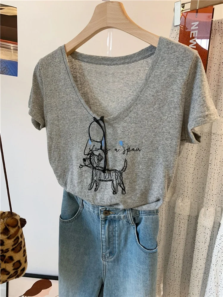 Korean Style Retro Low V-Neck Short Sleeve T-Shirt Women's Spring Summer New Versatile Slimming Top Fashionable Casual Wear $12.44