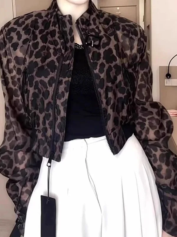 Elegant Zipper Stand Collar Leopard Print Women's Jacket Slimming Fashion Korean Style Short Outerwear Commute Style Loose Fit $50.11