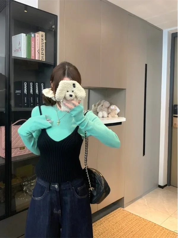 plus Size Korean Style Long Sleeve Knitted Sweater Women's Fashion Set with Strap Midi Dress Slimming Effect Layering Top $12.03