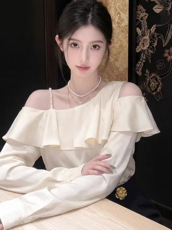 Spring 2026 Gentle Style Long Sleeve Women's Shirt Shoulder Bared Side Collar White Lace Hemline Fashionable Casual Top $14.93