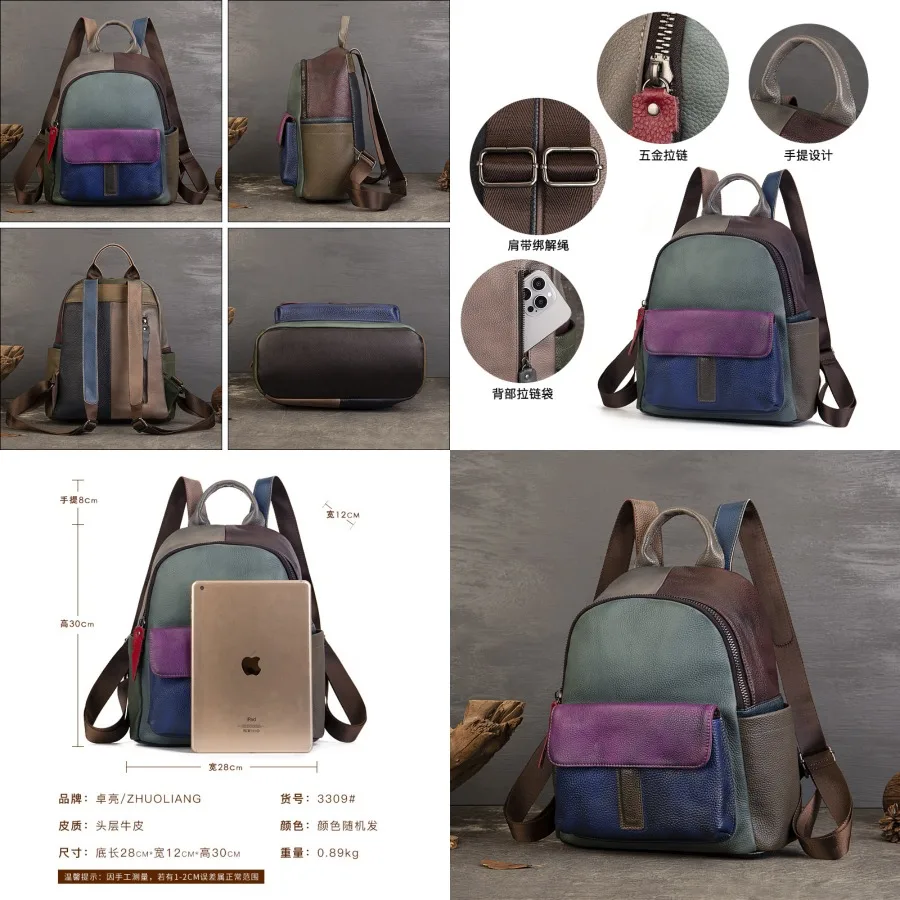 【New style】Genuine leather women's bag retro national style backpack colorful splicing backpack large-capacity fashionable and $122.22
