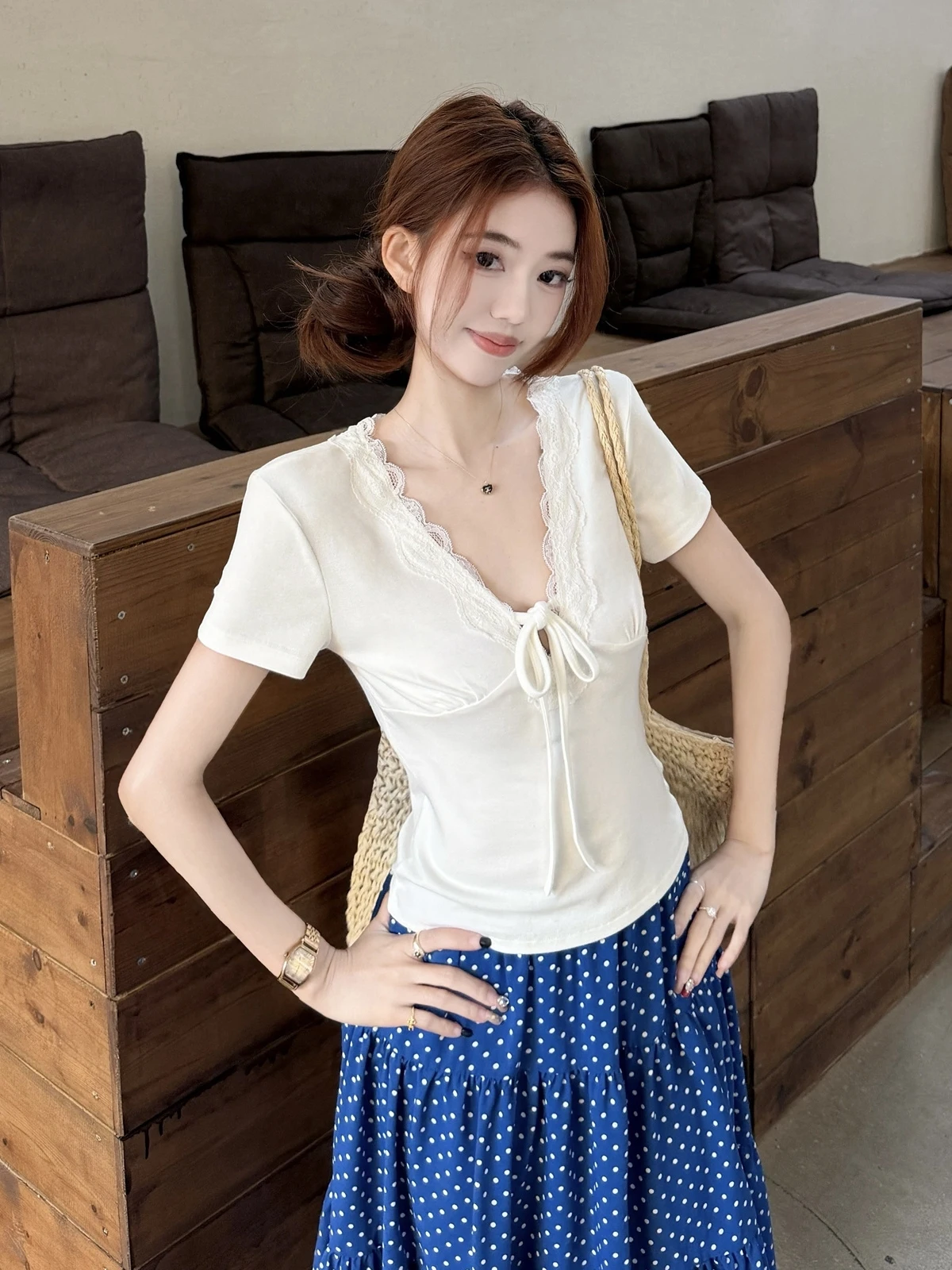White Lace Splice Tie V-neck Short Sleeve T-shirt Women's Early Spring New Design Sense Top Korean Style Commute Fashion $11.39