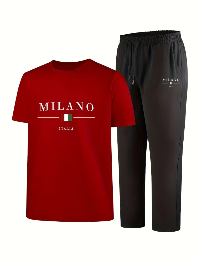 Summer Men's Fashion Italian Letter Print Breathable and Comfortable Round-Neck T-Shirt and Pants Set-Men's Outdoor Casual Wear $7.62