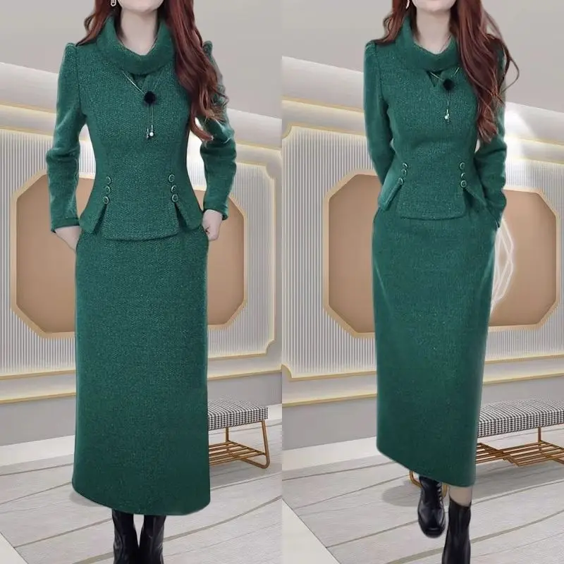 New High End Autumn Winter Green Two Piece Set Women Fashion High End Slim Turtleneck Long Sleeve Top + Elegant Skirt Suit $23.09