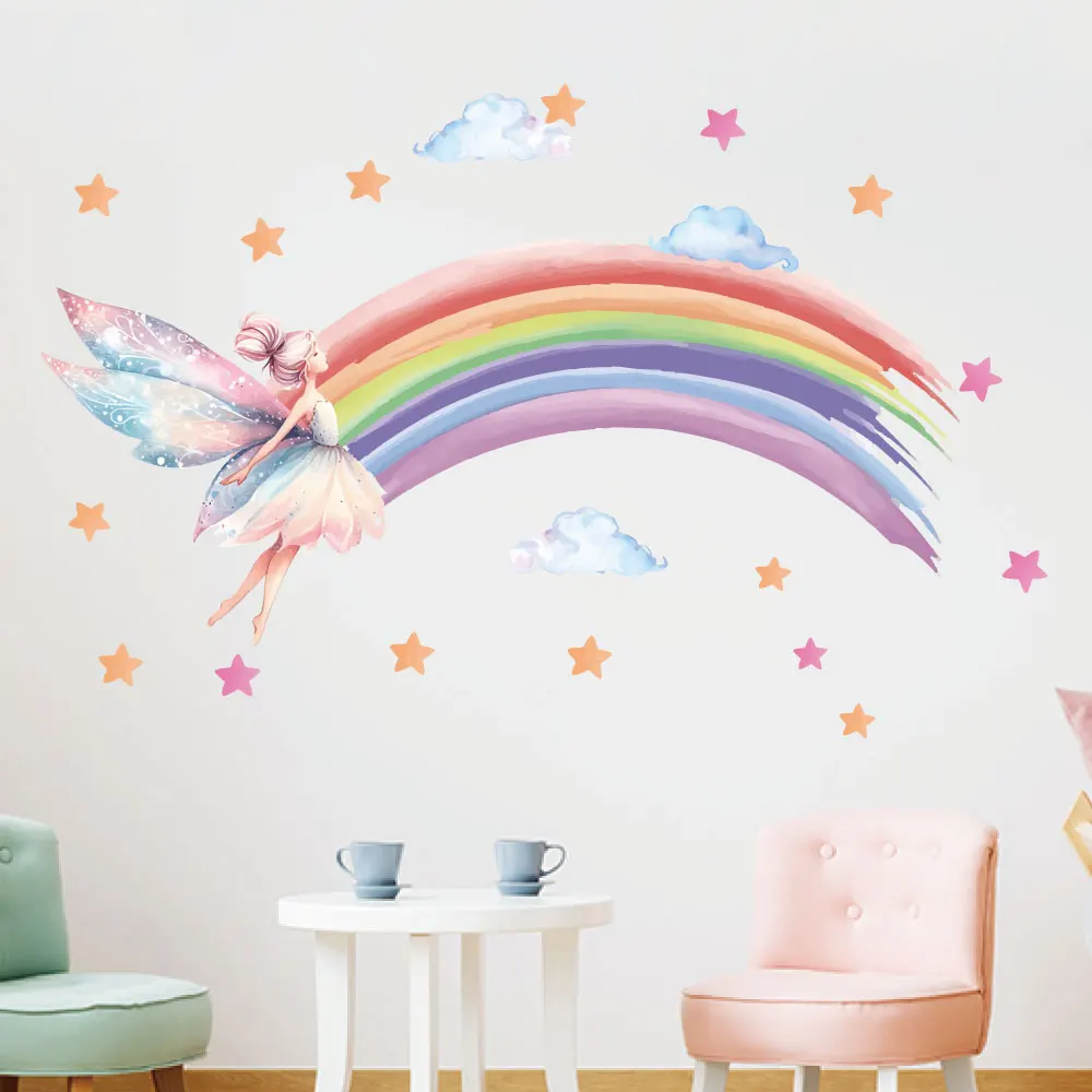 Boho design colorful fairy with rainbow wall sticker kids room decoration cartoon star wall decal $7.96