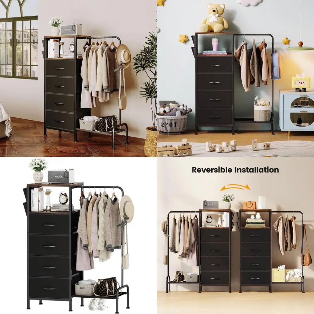 Double Hanging Rack Wardrobe, Reversible Design, 4 Drawers with Coat Rack and Side Pockets, Black Children's Bedroom Furniture $63.48