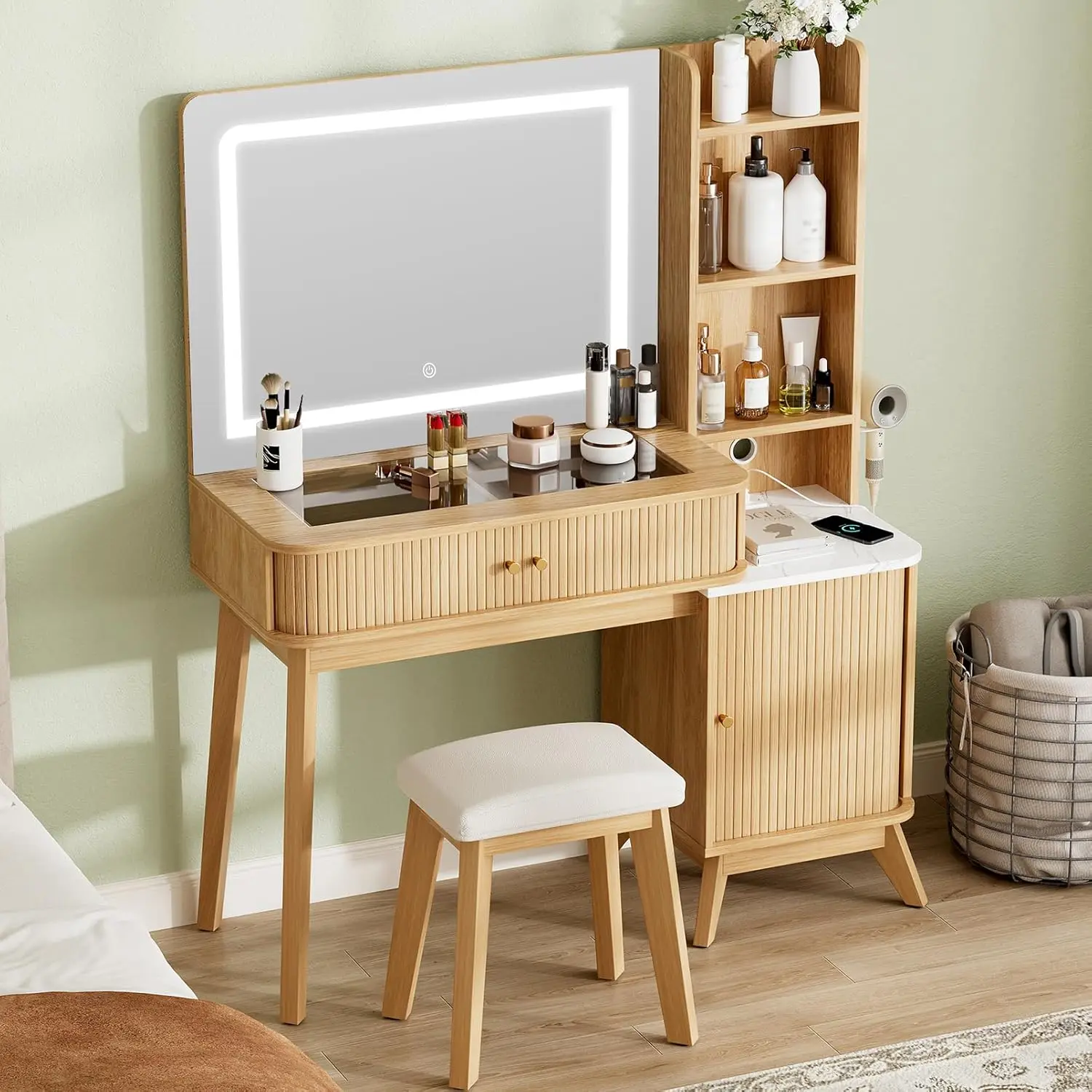 Fluted Makeup Vanity Desk with Mirror LED Lights Glass Top Sliding Door Power Outlets 3 Lighting Modes Natural Oak,Customized $202.33