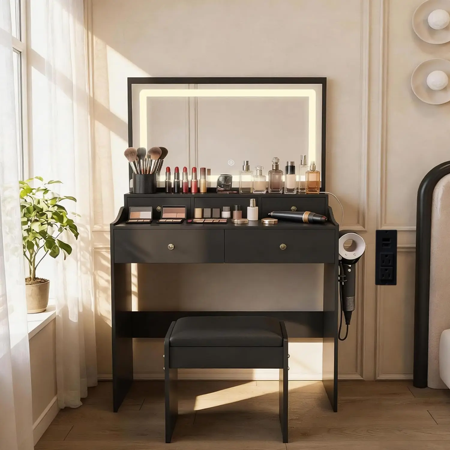 Black Vanity Desk with Mirror Lights Chair 5 Drawers Power Outlet 3 Lighting Modes Hairdryer Rack, Customized $177.98