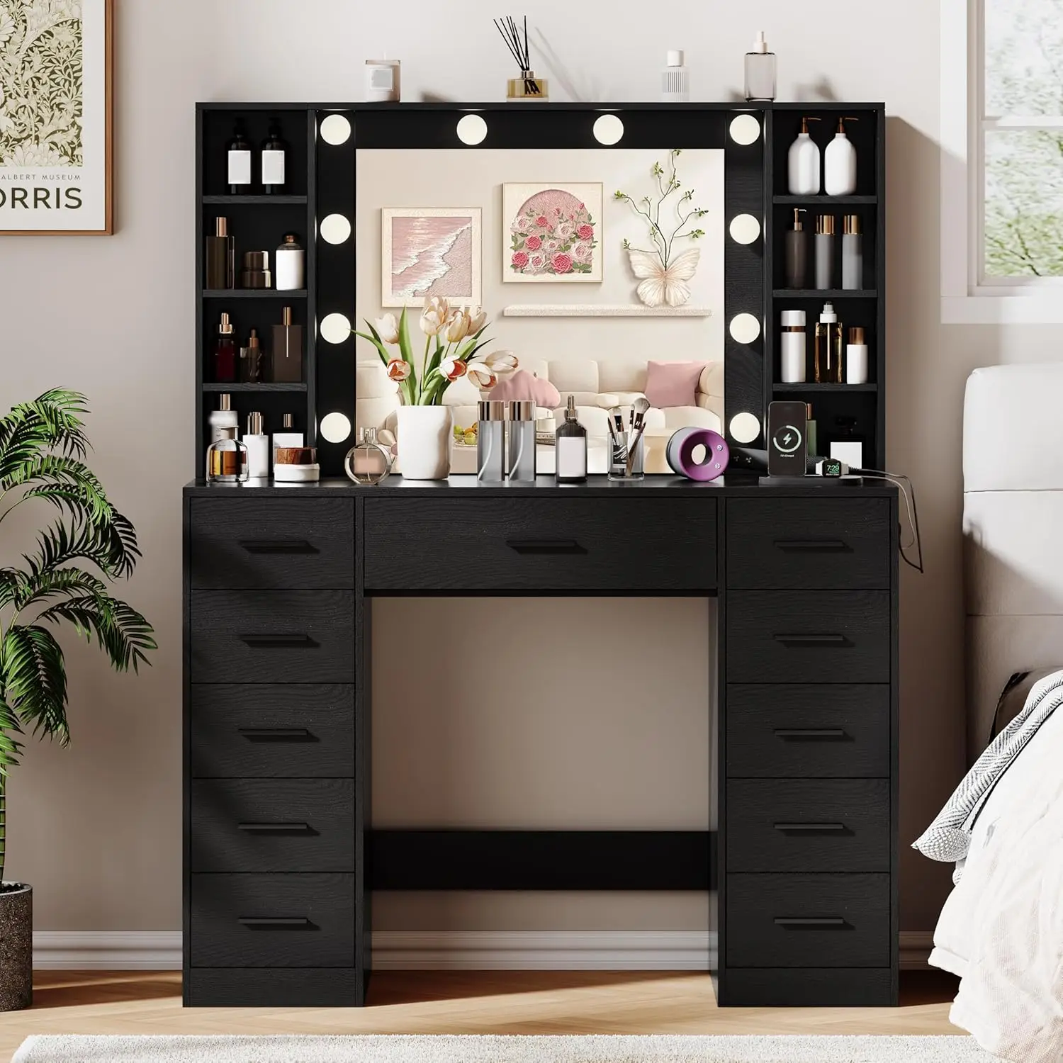 Black Dressing Table with Mirror LED Lights 11 Drawers 8 Shelves Power Outlet Bedroom 43in, Customized $234.19