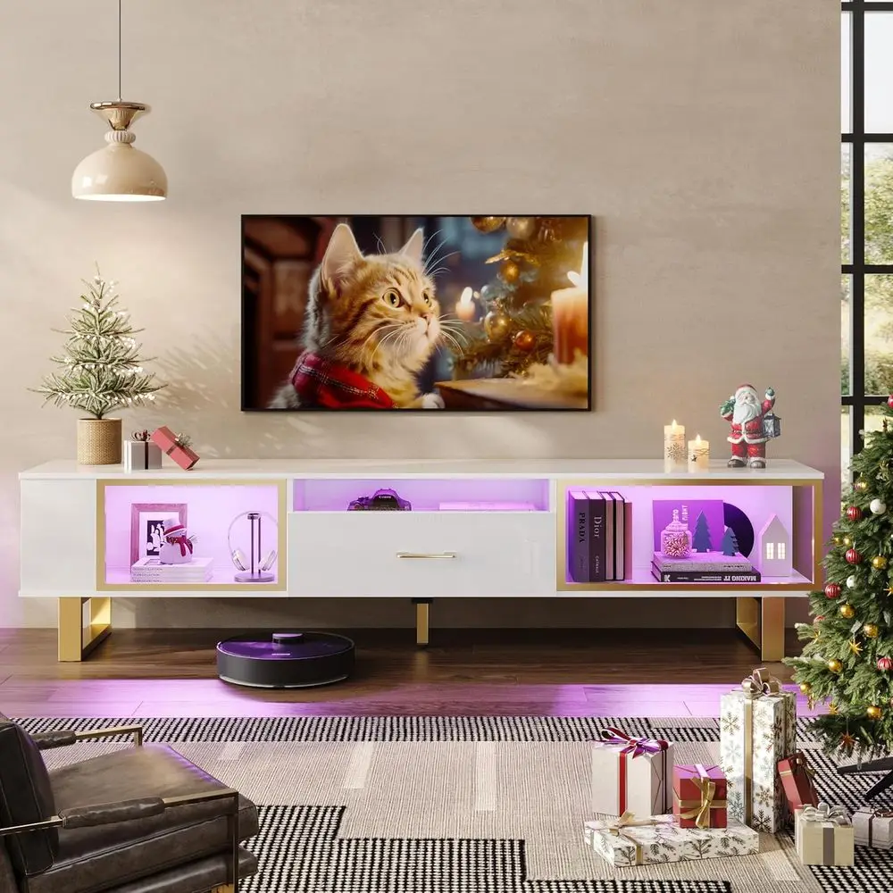 80 LED-lit TV Stand, Modern Entertainment Center with Open Shelves & Glass, Glossy Media Table for Living/Bedroom, White & Gold $303.04