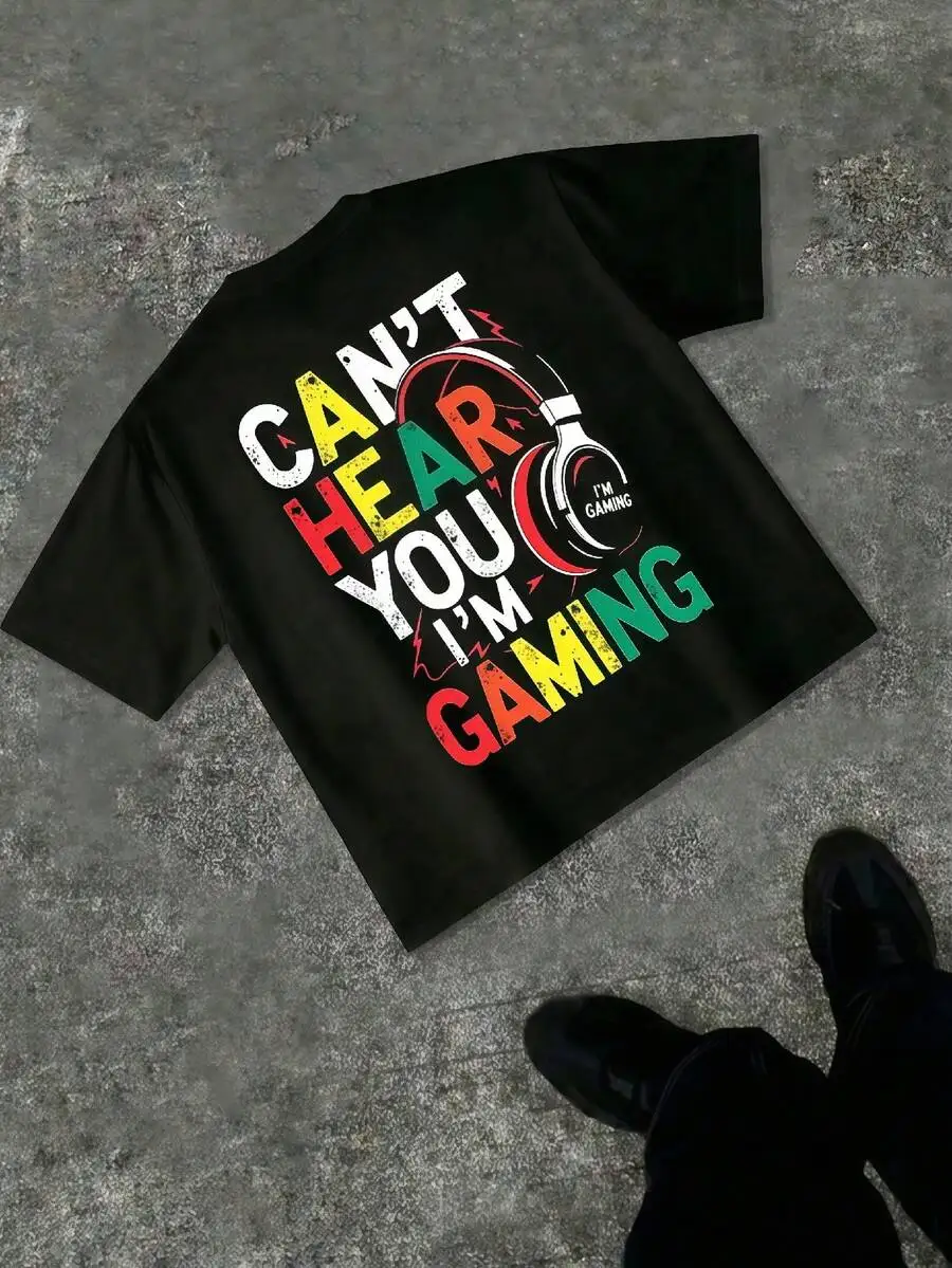 Men's Gaming T-Shirt - 'Can't Hear You I'm Gaming' Slogan & Headphones Graphic Print, Black With $5.75