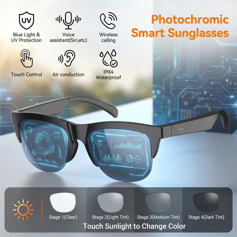 Photochromic Smart Glasses Anti Blue light Bluetooth V5.3 Call Headphones HIFI Men Women Sunglasses UV400 Sports Fishing Work $7.55