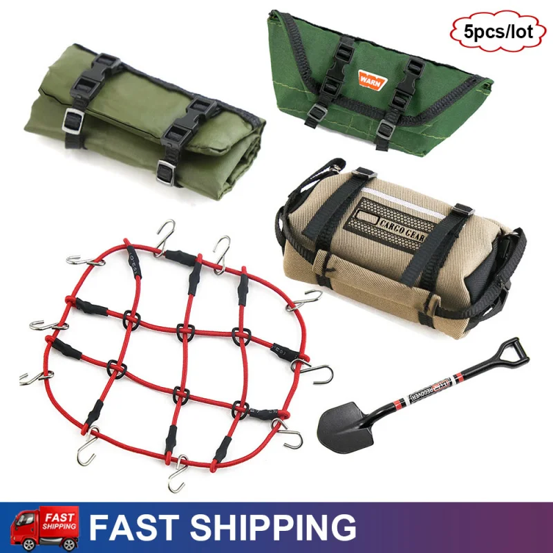 5PCS New 1/18 Storage Bag Roof Bag Luggage Sleeping Bag Net Shovel for TRX4M Axial SCX24 Bronco Defender RC Crawler Decoration $23.00