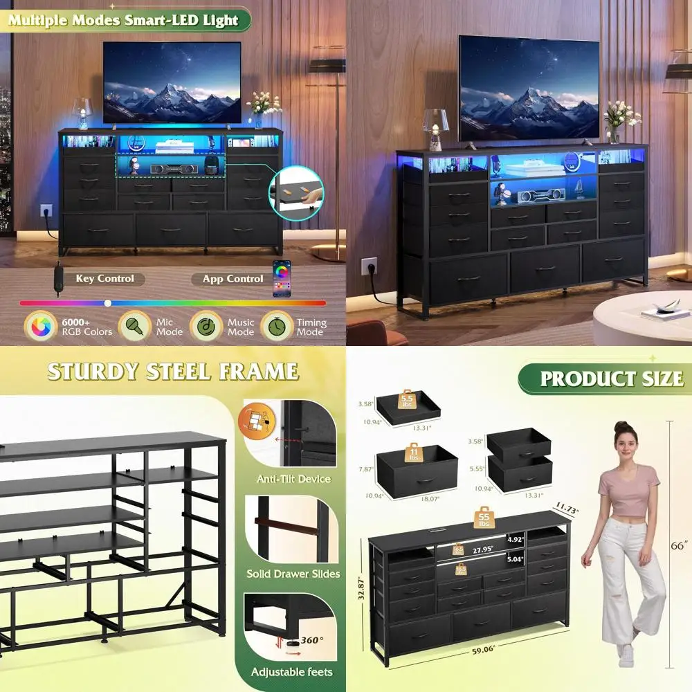 LED-lit Entertainment Center for 55-65 Inch TVs with Charging Station, 15-Drawer Media Console for Living Spaces $113.10